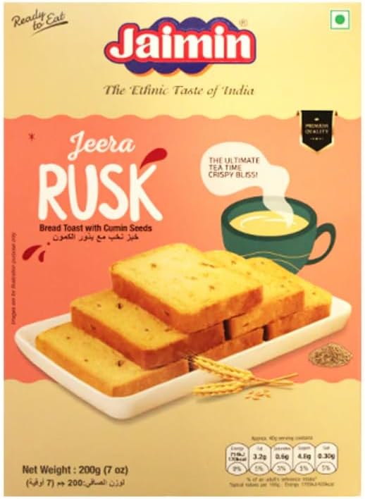 Jaimin Jeera Rusk (200g) is a popular Indian, twice-baked, crispy toast infused with the savory, aromatic flavor of cumin seeds (jeera). It is a firm, crunchy biscuit designed for dipping into tea or coffee, providing a sweet-and-salty, aromatic snack experience. It is suitable for vegetarians and commonly enjoyed during breakfast or as a teatime snack.
